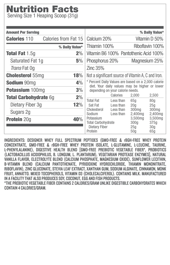 - 20g of natural protein per serving complete with all the Essential Amino Acids including Prebiotic Fiber to help you feel full